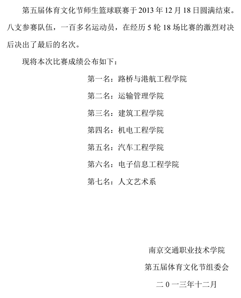 第五届体育文化节师生篮球联赛成绩公告