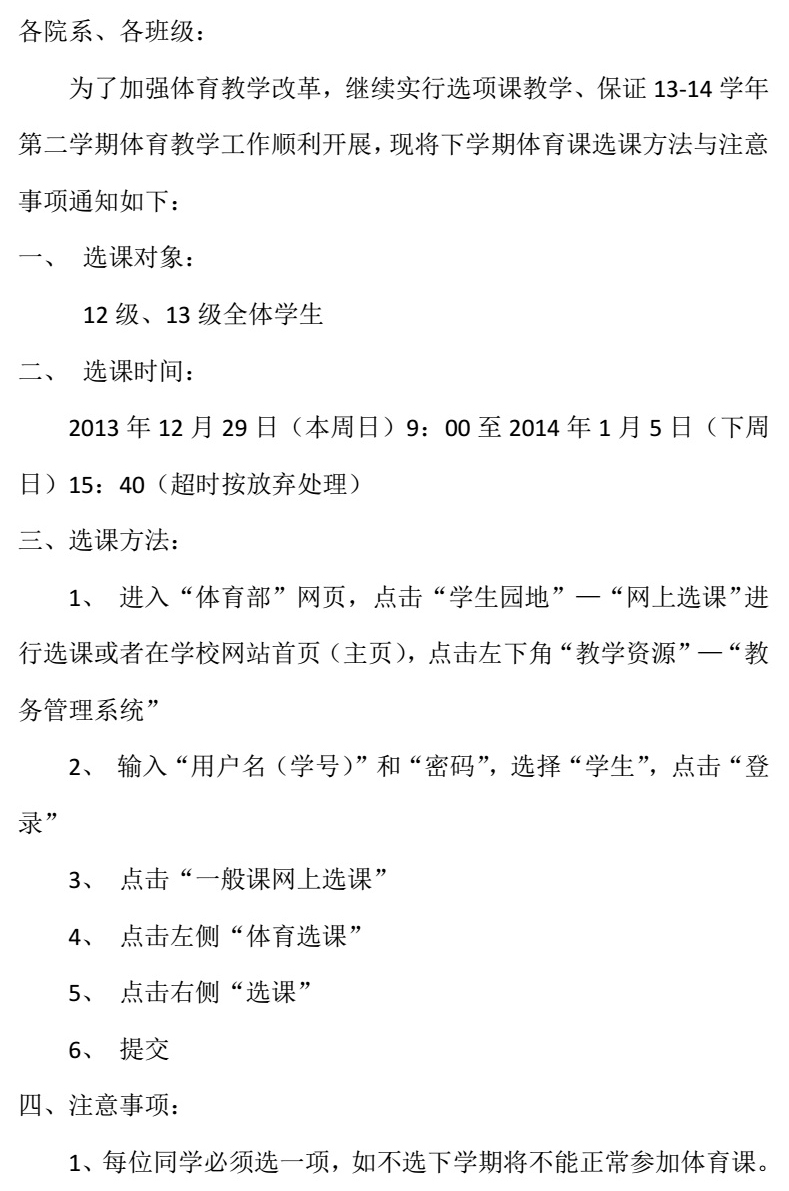 关于2013-2014-2学期体育课选课通知