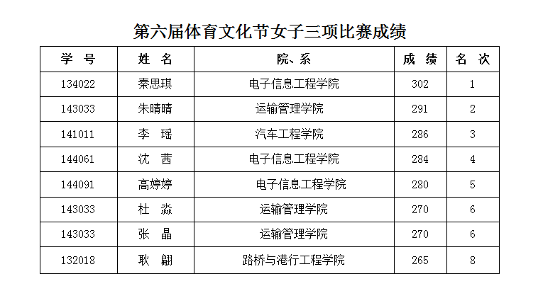 11月26日下午1点30分在田径场西篮球场准时举行。本次比赛共有7个院系50多名运动员参赛。经过激烈的角逐,最终来自电子信息工程学院秦思琪获得冠军,运输管理学院朱晴晴、汽车工程学院李瑶分获得亚军和季军