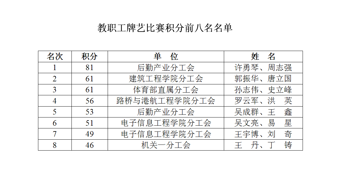 作为愉悦身心、彰显团结拼搏竞技精神的牌艺比赛活动,得到了广大教职工的积极参与和支持,共有26对选手报名参赛。比赛采用计时积分制,气氛热烈,经过两轮角逐,决出了积分前八名的选手。