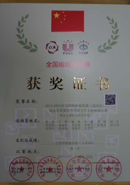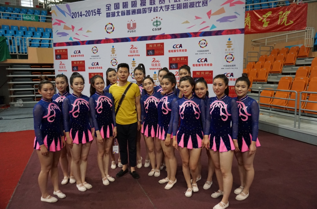 2015年全国啦啦操联赛于5月8-10日在武汉体育学院体育馆举行。本次比赛分为幼儿组、小学组、中学组、大学组、俱乐部组5个竞赛组别,共有104所学校的131个代表队总计2137名运动员参加比赛。我校啦啦操代表队在参加大学甲组集体爵士自选动作的比赛中荣获第一名。