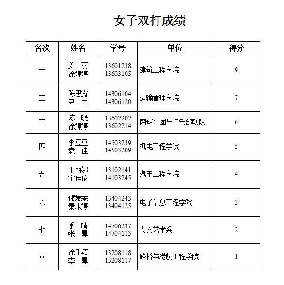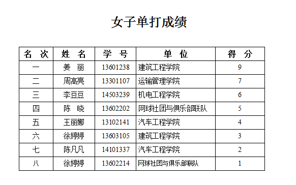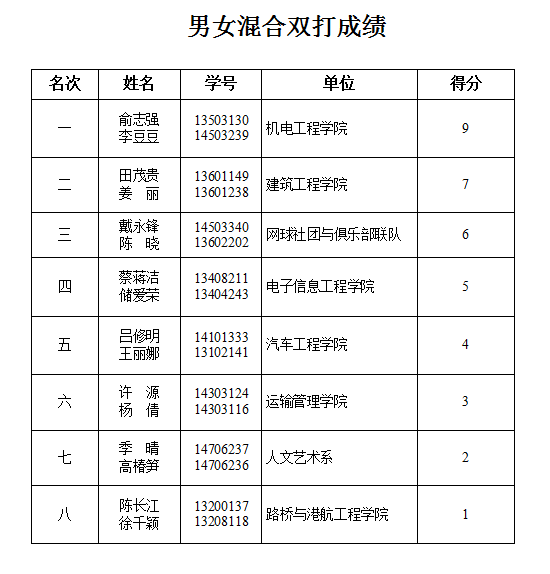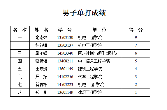 5月19日—6月26日,在学校网球场举行了2015年学生网球比赛。七院系网球队和学院网球社团、俱乐部联队90余名学生参与了本次比赛,历时30余天,经过156场技术与战术的较量。现将比赛成绩公布如下: