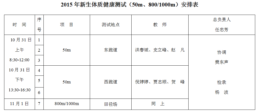 2015年新生体质健康测试(50m、800/1000m)安排表
