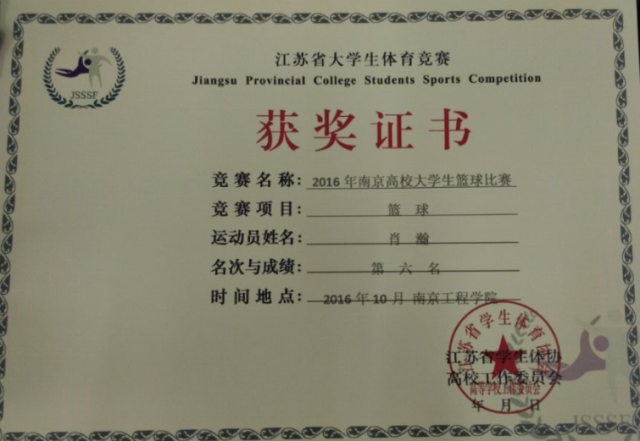 2016年10月22日至11月12日,我校男篮在参加了由江苏省学生体协高校工作委员会南京分会主办,南京工程学院和南京晓庄学院承办的“2016年南京高校大学生篮球比赛”。比赛中同学们团结协作、奋勇拼搏,最终取得了男子乙组(高职高专)第六名的成绩。