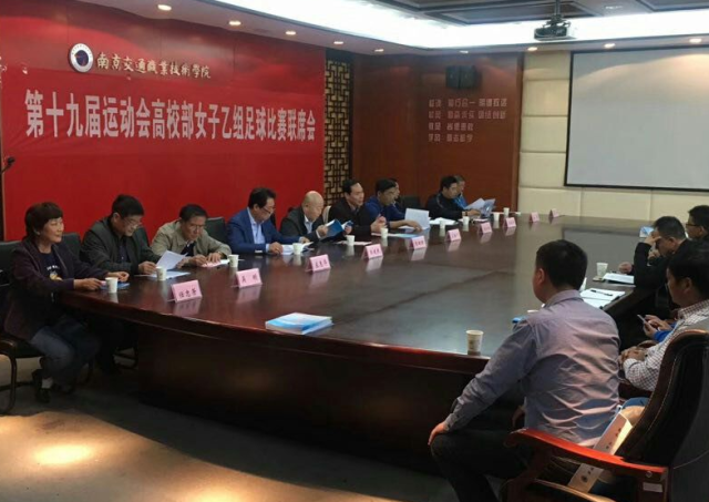 2017年10月21日下午,江苏省第十九届运动会高校部女子乙组足球比赛联席会议在学院召开。参加会议的嘉宾有:省教育厅体卫艺教处张鲤鲤处长;南京交通职业技术学院体育运动委员会主任应海宁副院长;省校园足球办公室执行主任、省学生体协高校工作委员会足球分会主任王建民教授;省学生体协高校工作委员会庄惠华顾问;省学生体协高校工作委员会秘书长,南京工业大学体育部主任张天峰教授;省学生体协高校工作委员会副主任,南京信息职业技术学院体育部主任梁培根教授;省学生体协高校工作委员会副秘书长吴明教授;各个参赛单位的领队、教练以及执行本次比赛的裁判长、裁判员。会议由学院体育运动委员会副主任、体育部主任任忠芳主持。