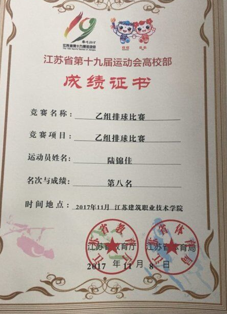 11月1-8日,由江苏省教育厅、江苏省体育局主办的每四年举行一次的江苏省第十九届运动会(高校部)乙组排球比赛在江苏建筑职业技术学院(女排比赛)和九州职业技术学院(男排比赛)举行。我院运动员在比赛中克服困难、不畏强手,以顽强的精神赛出了风格、赛出了水平。最终我院男、女排球队分别获得第三、第八的佳绩。