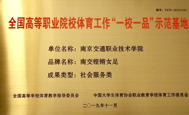 2019年11月,由中国大学生体育协会职业教育学校体育工作委员会、教育部全国高等学校体育教学指导委员会公体组和教育部职业院校教育类专业教学指导委员会体育分会等专家共同组成评审委员会,通过网络视频评审、现场评审、佐证材料复核、会议综合评议、公示等程序,对全国高等职业院校体育工作“一校一品”示范基地培育项目进行了评审,南京交院“铿锵女足”光荣入选。