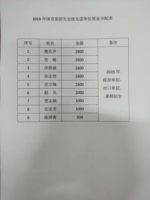 体育部2019年招生宣传获学院先进单位表彰,根据招生宣传参与实际工作量,拟定以下奖金分配明细。特此公示,公示时间6月5日至6月7日。大家对公示有何反映,请在公示期内与樊东声联系,联系电话:18168086286