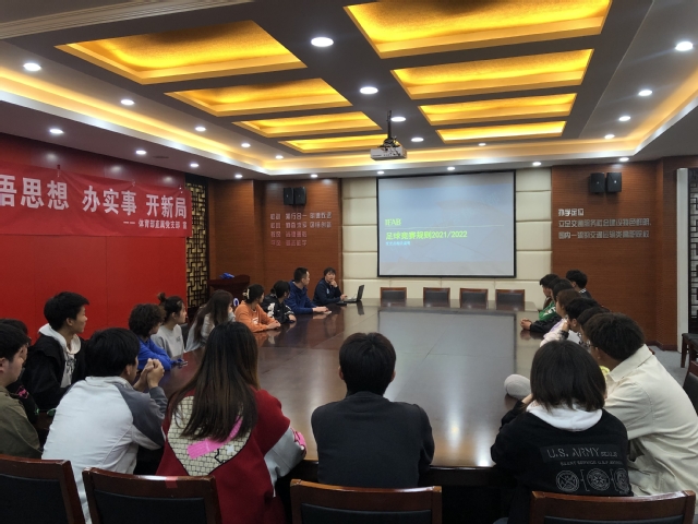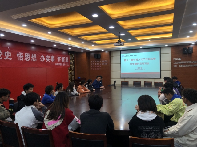 为顺利举办“南京交院第十三届体育文化节足球比赛”,体育部于3月11日下午,在行健馆会议室举行足球裁判员培训。会议由竞赛教研室主任唐曹恺夫主持,校足球队教练陈烨青老师主讲,全体学生裁判员参加本次培训。