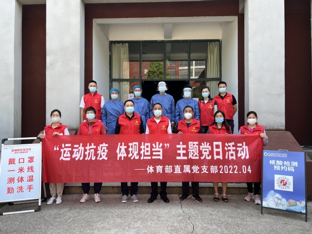 2022年4月,体育部直属党支部全体党员响应学校疫情防控工作组的号召,严格按照抗击疫情的工作要求,强化责任担当,团结一致,众志成城,开展了“运动抗疫、体现担当”主题党日活动,为打赢疫情防控阻击战贡献体育人的力量。