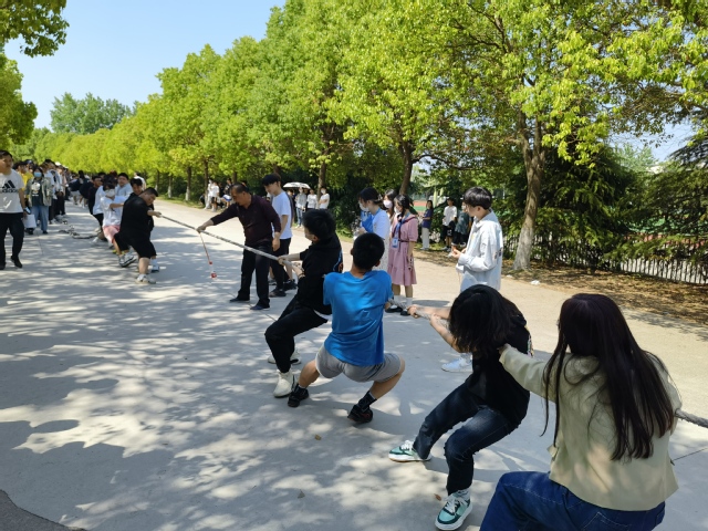 为丰富广大学生校园体育文化生活,缓解学习压力,提高同学们战胜疫情的信心和勇气,体育部有序开展了丰富多彩的线下系列体育活动。经过前期认真的准备,5月4日下午,第十三届体育文化艺术节班级拔河比赛在田径场正式打响。本次拔河比赛以班级为单位组成队伍参赛,共计60支代表队,每队14人,比赛采用三局两胜淘汰制的方式,以抽签分组决定比赛顺序。