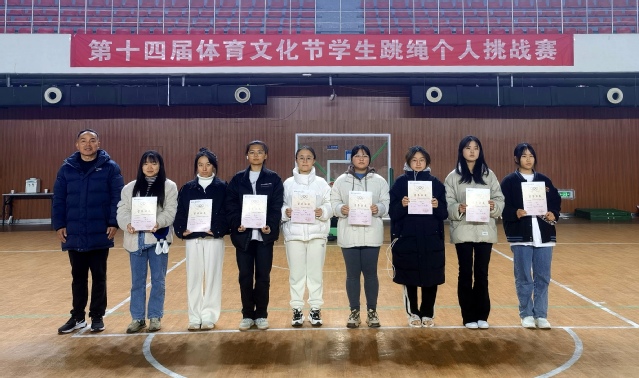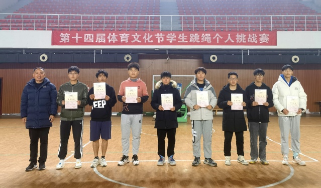 学院第十四届体育文化节学生跳绳挑战赛由院体育运动委员会主办。全校共有600多名学生参加了本次比赛,经过两周的角逐,最终225051112石福锐同学、225061108胡益同学、221012326李文俊同学、225011115王名科同学、221041118程恒顺同学、223013119王一帆同学、212031244夏子系同学、222011631唐旭东同学获男子组1-8名。223061111赵琪同学、227022110王阳同学、226021213董文慧同学、212011830徐澜同学、223023121牛方同学、226021209陈宇琪同学、223011110郑彤彤同学、223021203陈芬同学获女子组1-8名。
