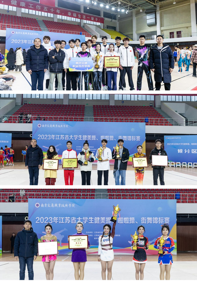 2023年江苏省大学生健美操、啦啦操、街舞团体成绩如下:健美操团体项目专业院校组:第一名南京体育学院、第二名扬州大学;高专高专组:第一名南京交通职业技术学院、第二名南京信息职业技术学院;普通院校组:第一名南京信息工程大学;啦啦操团体项目专业院校组:第一名南京大学、第二名扬州大学;高专高专组:第一名苏州工业园区服务外包职业学院、第二名江苏护理职业学院、第三名江苏城乡建设职业学院、第四名江苏医药职业学院、第五名南京旅游职业学院;普通院校组:第一名中国药科大学、第二名南京信息工程大学、第三名南京大学;街舞团体项目专业院校组:第一名:江苏科技大学;高专高专组:第一名常州工程职业技术学院、第二名江苏建筑职业技术学院、第三名南京旅游职业学院、第四名江苏电子信息职业学院、第五名:苏州经贸职业技术学院、第六名无锡职业技术学院、第七名江苏信息职业技术学院;普通院校组:第一名江苏大学、第二名南京传媒学院、第三名南京邮电大学、第四名南京农业大学、第五名南京医科大学、第六名常州工学院、第七名中国药科大学、第八名宿迁学院。